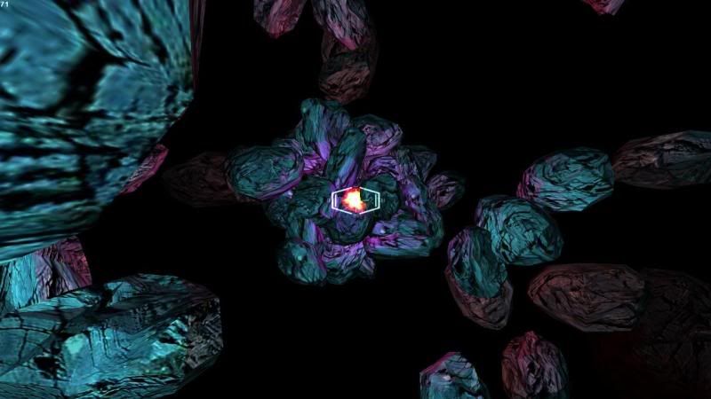 It's 3D asteroids, but with a twist: instead of being in "flat" 3D space, it's on the surface of a "hypersphere" in 4 dimensions. This means is that it feels like 3D, but if you fly in a straight line, you come back to where you started.