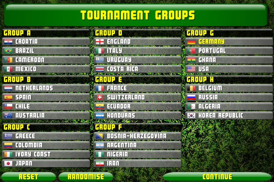 Tournament Mode - Pick your country from 137 nations and try and take them all the way to World Cup glory! You can have as many human controlled teams as you want so get some friends together and see who can take there team to the final! The tournament automatically saves so you can always finish the tournament later if you are struggling for time.